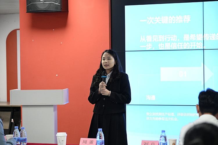 国际销售部邓丹分享了一次化解信任危机的经历。面对突发状况引发的客户疑虑,她连夜配合客户时区召开视频会议,坦诚说明情况,主动承担工作疏漏,并迅速推动整改方案落地,最终重新赢得客户认可。她用实际行动诠释了“订单有价,信任无价”,也让在场许多销售人员深受触动。
